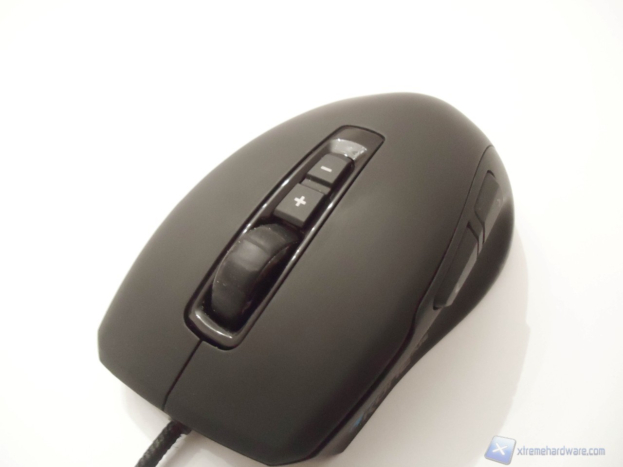 Guardando il mouse dall’alto notiamo che la superficie è completamente rivestita da un materiale gommato chiamato Soft-Touch che ottimizza il grip della mano sul dispositivo e limita la sudorazione della stessa. Oltre ai classici click destro e sinistro, troviamo i 2 tasti per la variazione dei DPI on-the-fly; se azionati, abilitano la funzione Roccat TALK, che ci segnala vocalmente l’ammontare dei DPI utilizzati. In passato alcuni mouse Roccat soffrivano di accumuli di polvere sul sensore dello scroll, causandone il suo malfunzionamento dopo qualche tempo. Ora sembra che lo scroll adottato da Roccat per la nuova linea Kone sia stato completamente riprogettato, e la nuova Titan-Whell dovrebbe risolvere i piccoli difetti di progettazione dei vecchi mouse della serie.