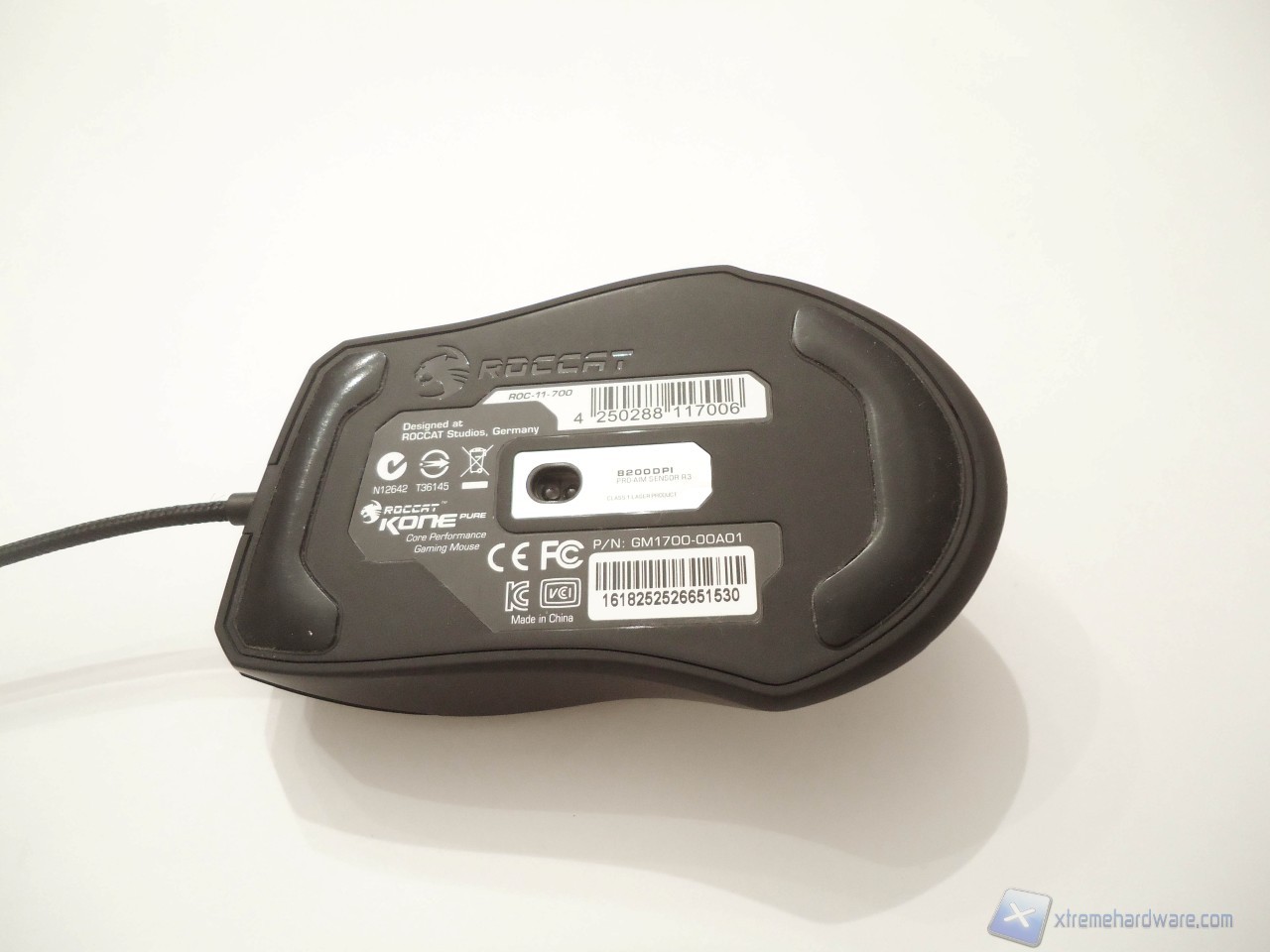 Capovolgendo il Kone Pure mettiamo in mostra come da foto la superficie inferiore della periferica. Al centro del mouse troviamo il sensore Avago 9800 da ben 8200 DPI circondato da due grandi piedini in teflon, che rendono il Kone scorrevole su tutte le superfici. Oltre a questi elementi, sono riportate le varie certificazioni del prodotto, il part number e il luogo di produzione accompagnate dal logo e nome dell’azienda impresse direttamente sulla plastica.