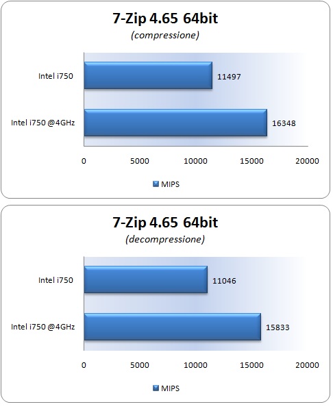 In questa sede andremo ad analizzare il comportamento della cpu Intel i5 750 presa in esame, valutando le sue prestazioni sulla scheda madre MSI P55-GD85, a due frequenze di funzionamento, la prima con la cpu a default e con turbo attivo, e la seconda con una frequenza operativa di 4 GHz e turbo disattivato.